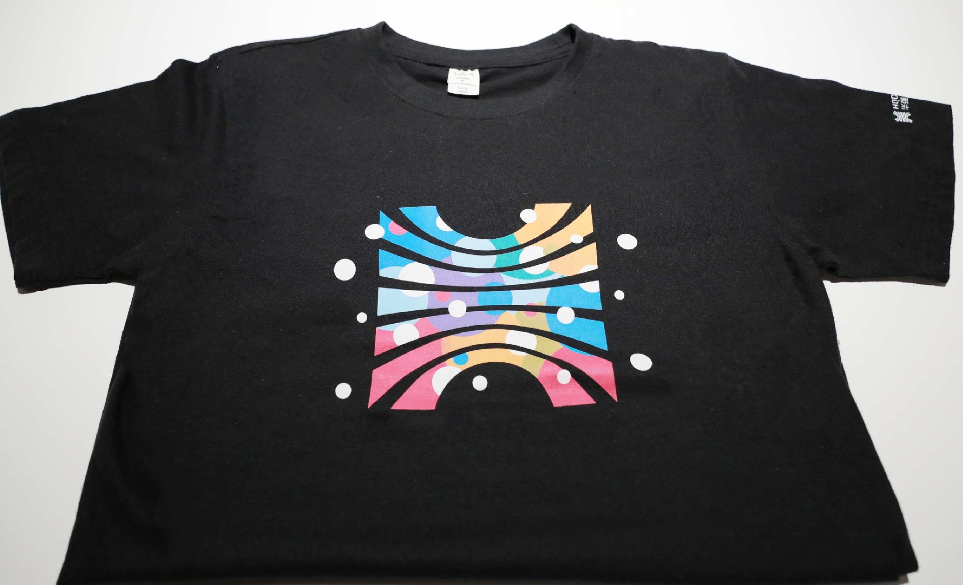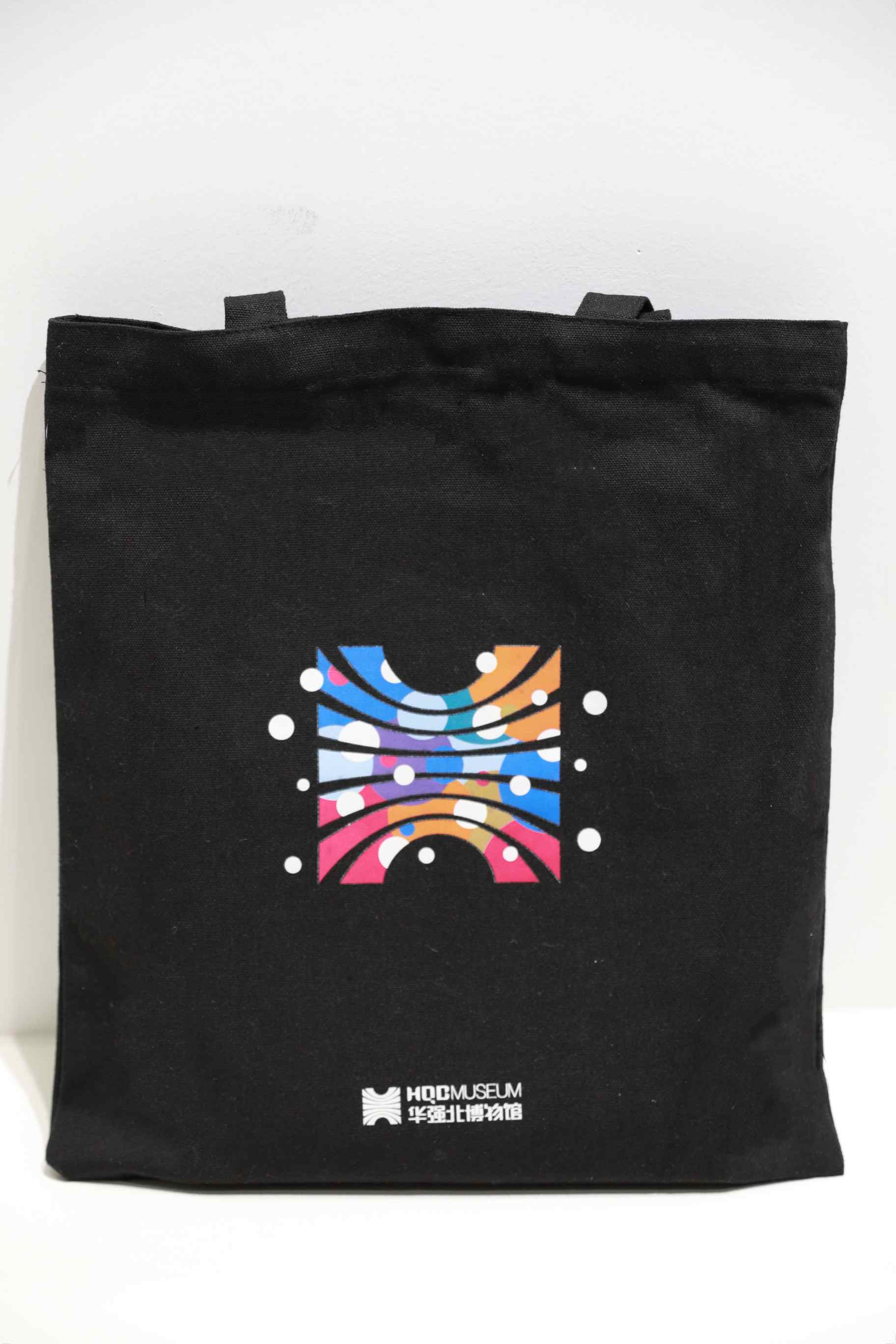黑色帆布材质的手提袋,主图案以华强北博物馆logo为设计,用色彩斑斓的点状元素组合,呼应华强北的电子、创新产业属性,强化文化归属与纪念意义,让博物馆里的城市记忆,以鲜活实用的方式融入生活,传递属于华强北的多元创新魅力。