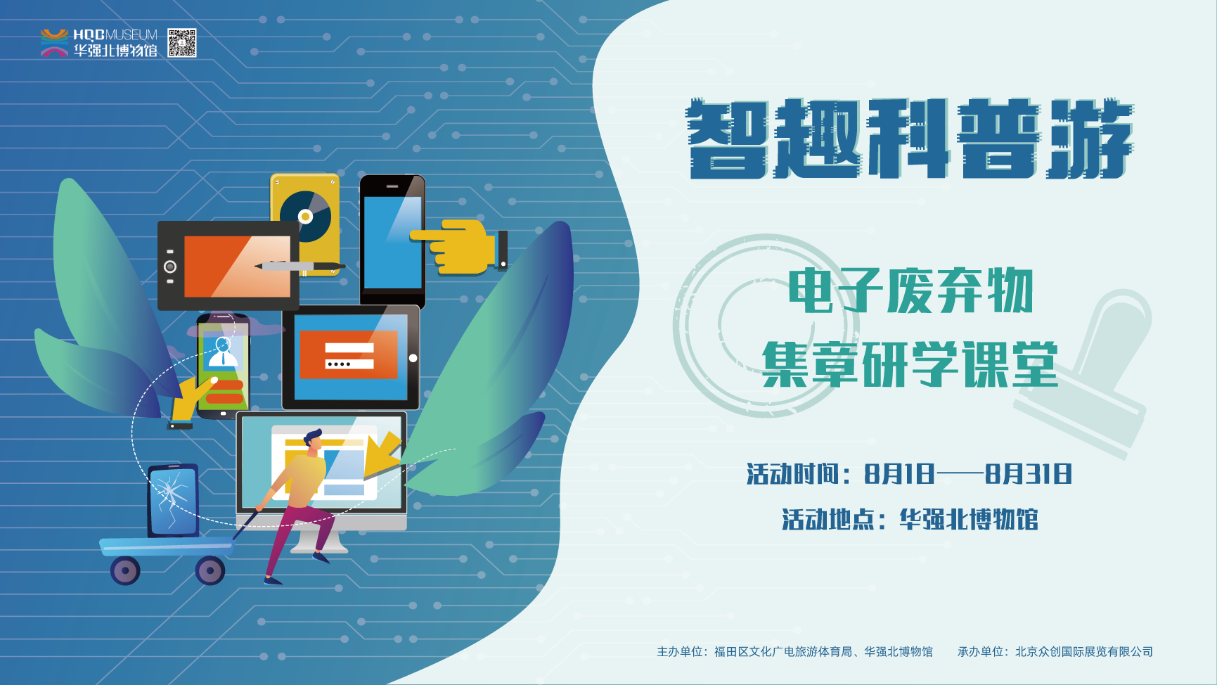 2024年8月1日—31日,华强北博物馆的“垃圾?还是宝藏?——电子废弃物科普展”,犹如一股清新的绿色科技之风,激发了观众对环保科技的无限热情。在这场电子废弃物的科普探险中,我们共同见证了知识的力量与环保的魅力。虽然活动已落下帷幕,但环保的征途仍在继续。让我们携手并进,将这份对绿色未来的憧憬转化为实际行动,用科技的力量守护我们共同的家园!