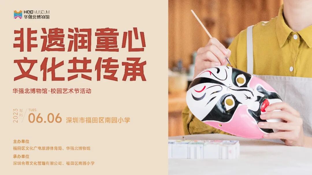 六月的初夏,阳光灿烂,蓬勃向上;六月的校园,童心闪耀,激情飞扬。为让更多的青少年了解“京剧脸谱”这项非物质文化遗产,华强北博物馆在6月6日联合南园小学开展了“非遗润童心 文化共传承”校园艺术节主题活动。活动现场特邀深圳市罗湖区非物质文化遗产“脸谱面具绘画技艺”项目的代表性传承人——彭芳老师,为孩子们开启了一场奇妙的非遗文化之旅。