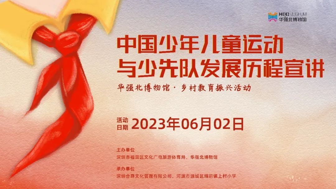 为深入贯彻落实《关于做好2023年全面推进乡村振兴重点工作的意见》,华强北博物馆在2023年6月2日联合大鹏新区同心义工队走进河源市源城区埔前镇上村小学,开展“中国少年儿童运动与少先队发展历程”的宣讲教育活动,这是华强北博物馆第三次与上村小学以教育振兴为目标进行的馆校共建活动,也是华强北博物馆践行助力乡村振兴,打造博物馆高质量发展的重要举措。