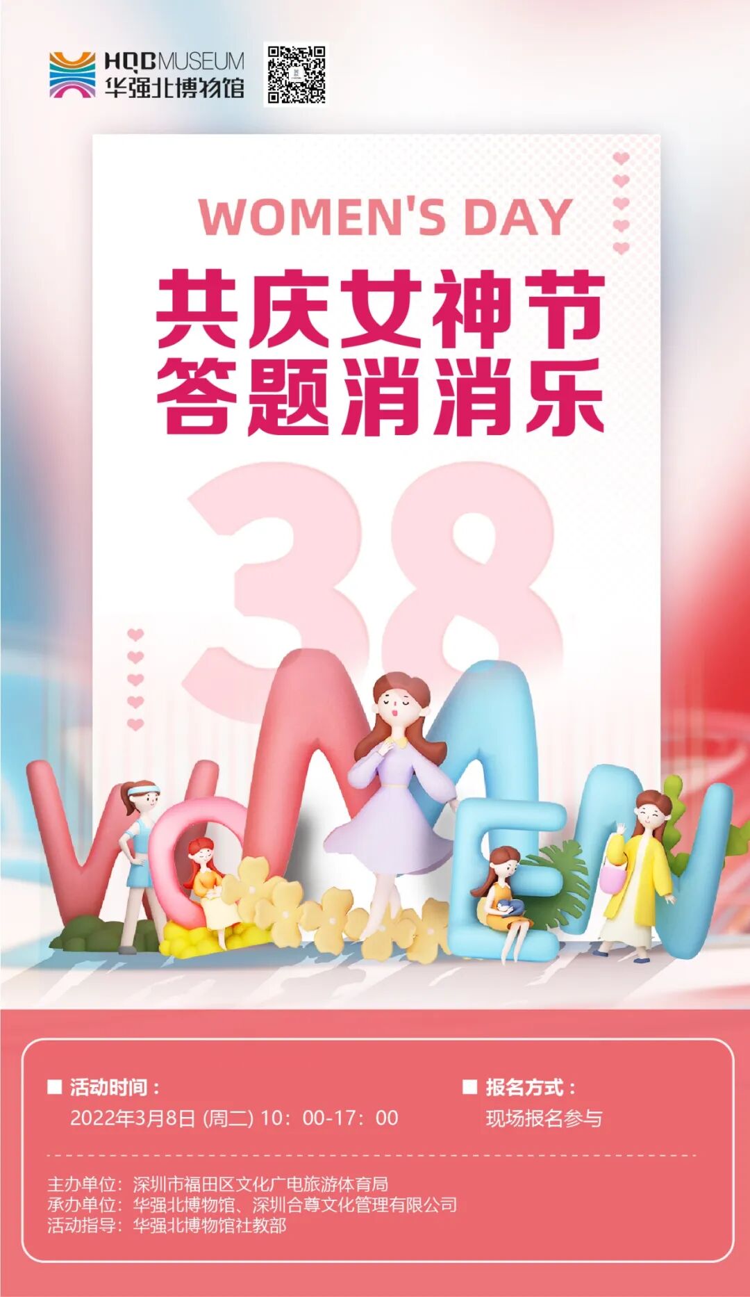 为庆祝“三八妇女节”,传播博物馆文化,给广大女性观众带来诗意和雅致的艺术熏陶,华强北博物馆特在3月8日举办《“共庆女神节 答题消消乐”活动》,以答题的形式回顾华强北博物馆曾经举办的展览、社教活动,了解三八妇女节的节日由来,赏析妙趣横生的古诗词。