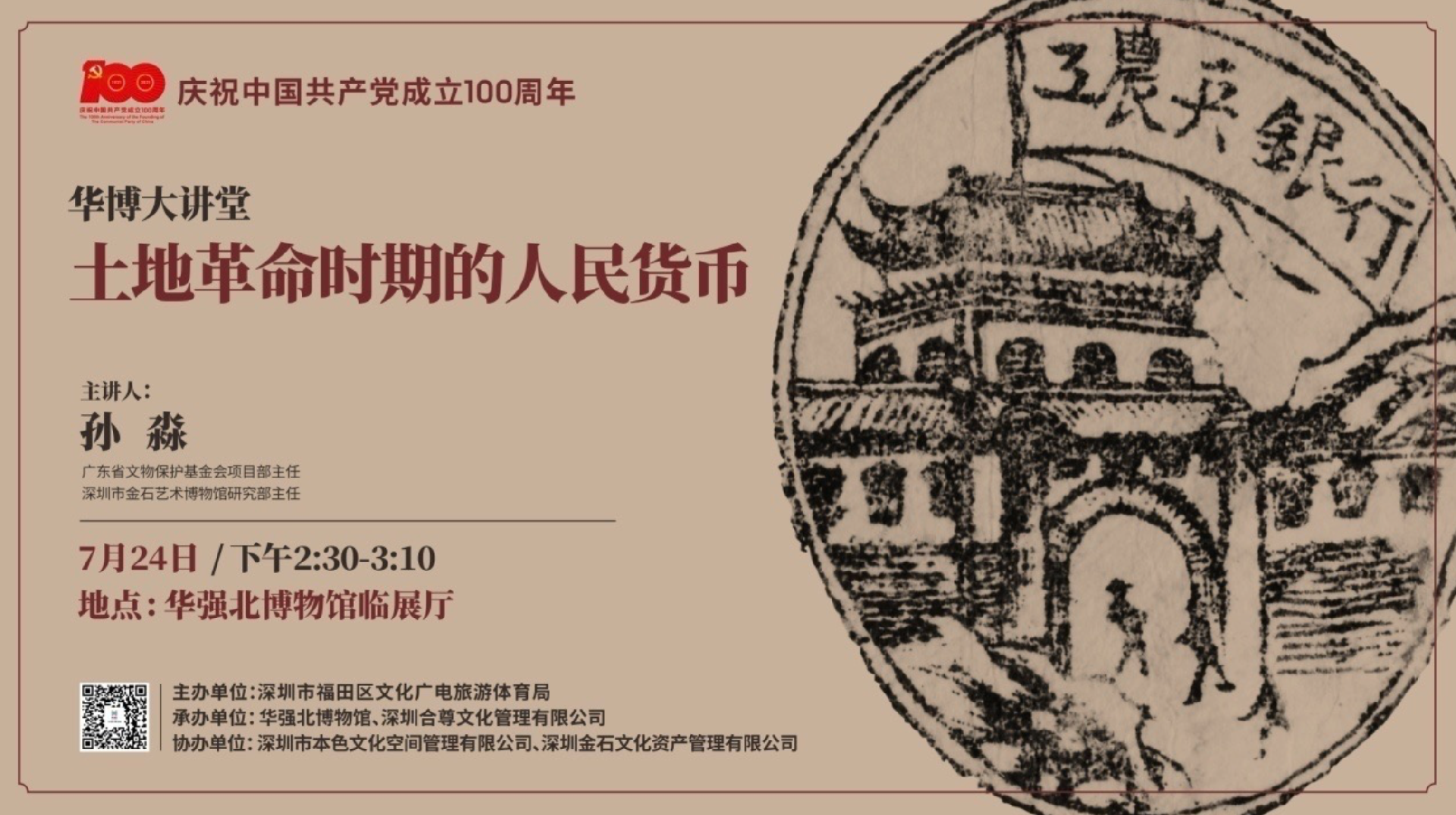 为庆祝中国共产党成立100周年,响应习近平总书记“学党史、悟思想、办实事、开新局”的重要指示,全面准确理解“学史明理、学史增信、学史崇德、学史力行”的核心要义,华强北博物馆特邀请广东省文物保护基金会项目部主任、深圳市金石艺术博物馆研究部主任孙淼先生,解读早期人民货币在土地革命时期的作用,细致解析票面综合信息和其设计的历史沿革。