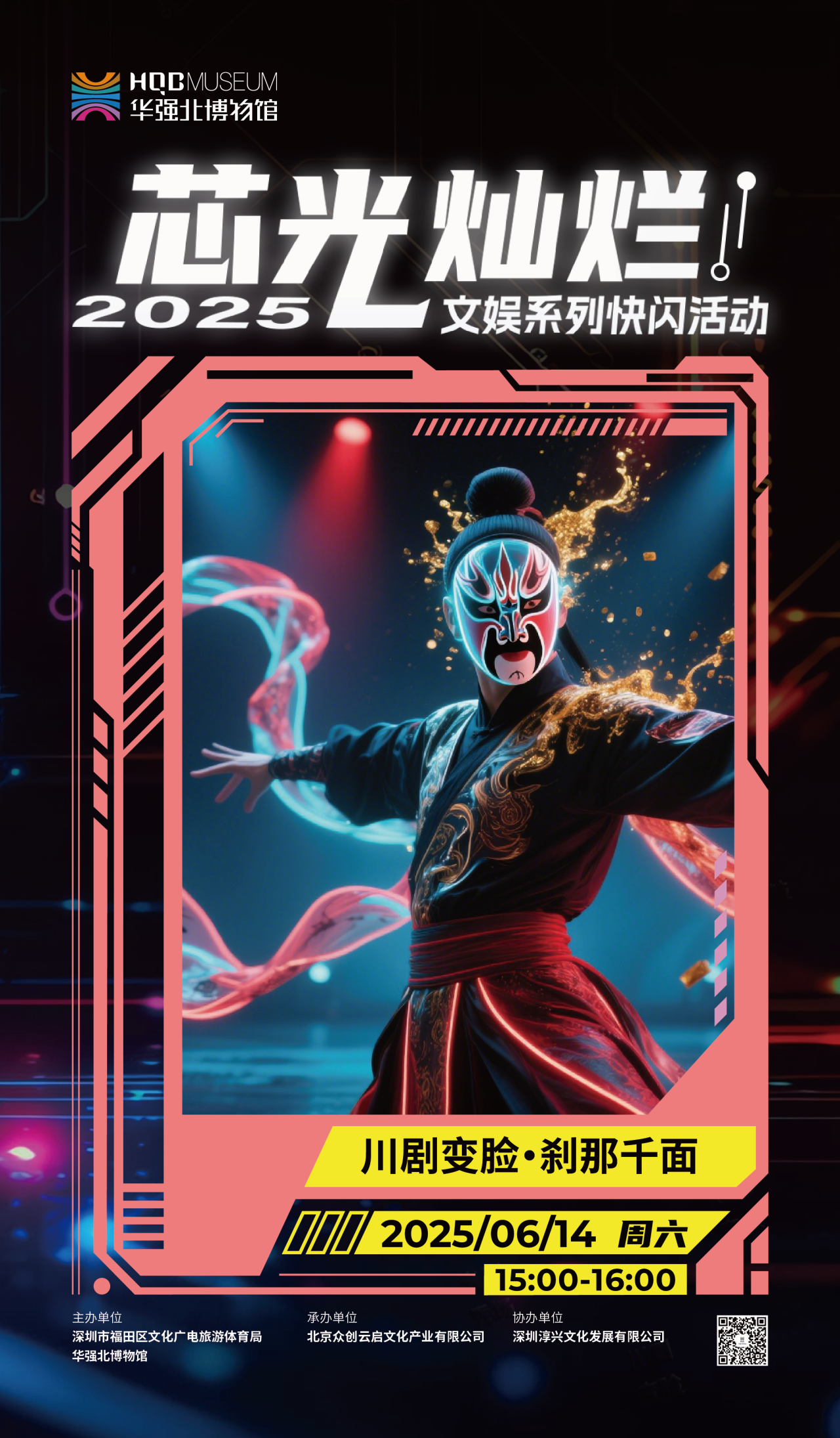 六月蝉鸣未落,文化薪火已在华强北博物馆燃起。2025年文化和自然遗产日主题为“让文物焕发新活力,绽放新光彩”,华强北博物馆积极响应,于6月14日举办“芯光灿烂”・文娱系列快闪活动——“川剧变脸・刹那千面”非遗沉浸式体验活动,让“中国电子第一街”的创新基因与千年非遗相互碰撞,续写古今交融的故事。